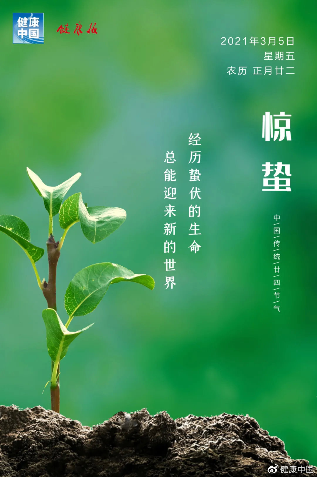 惊蛰,古代又称为“启蛰”,是指随着气温慢慢回升,天之阳气的生发,我们不仅可以看到树木长出新芽、开花,小草泛绿,冬季伏藏的动物也开始从土里钻出来,变得极为活跃,自然界一下子变得生机盎然。而这种特征在《黄帝内经》的《素问•四气调神大论》有描述,曰:“春三月,此谓发陈,天地俱生,万物以荣。”